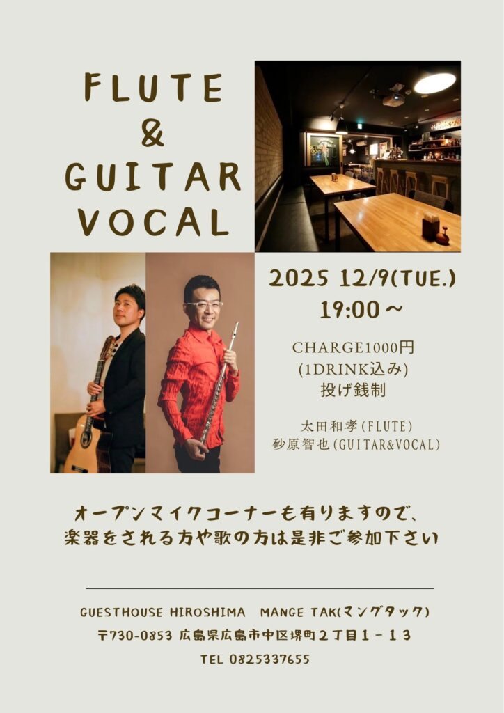 ●出演 砂原智也(vocal, guiar)、太田和孝(flute)