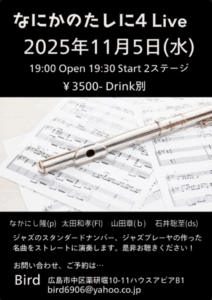 【日時】2025年11月5日(水) OPEN 19:00 / START 19:30 【出演】 なかにし隆 (piano)、太田和孝 (flute)、山田章 (bass)、石井聡至(drums) 【料金】¥3,500 + […]
